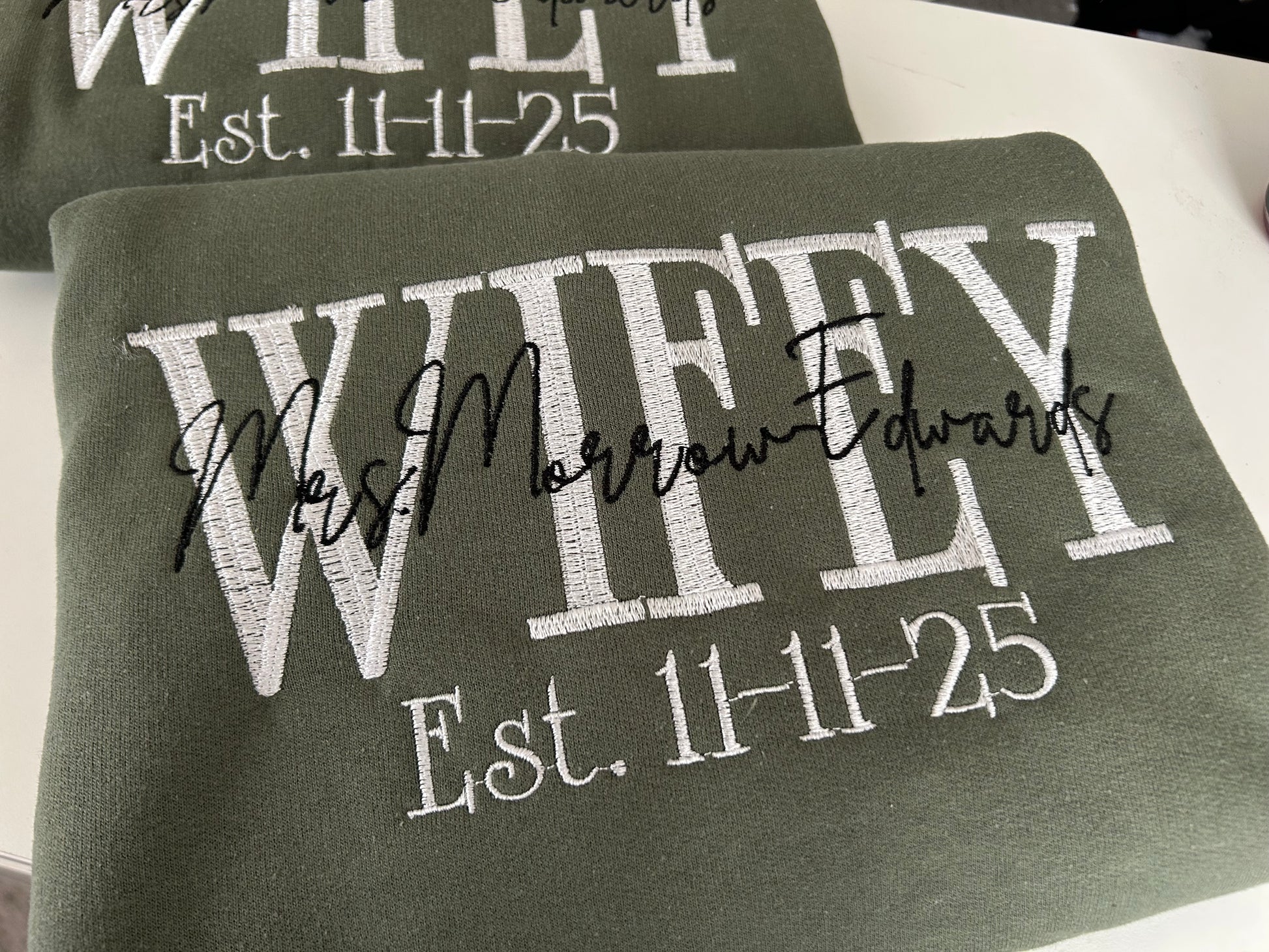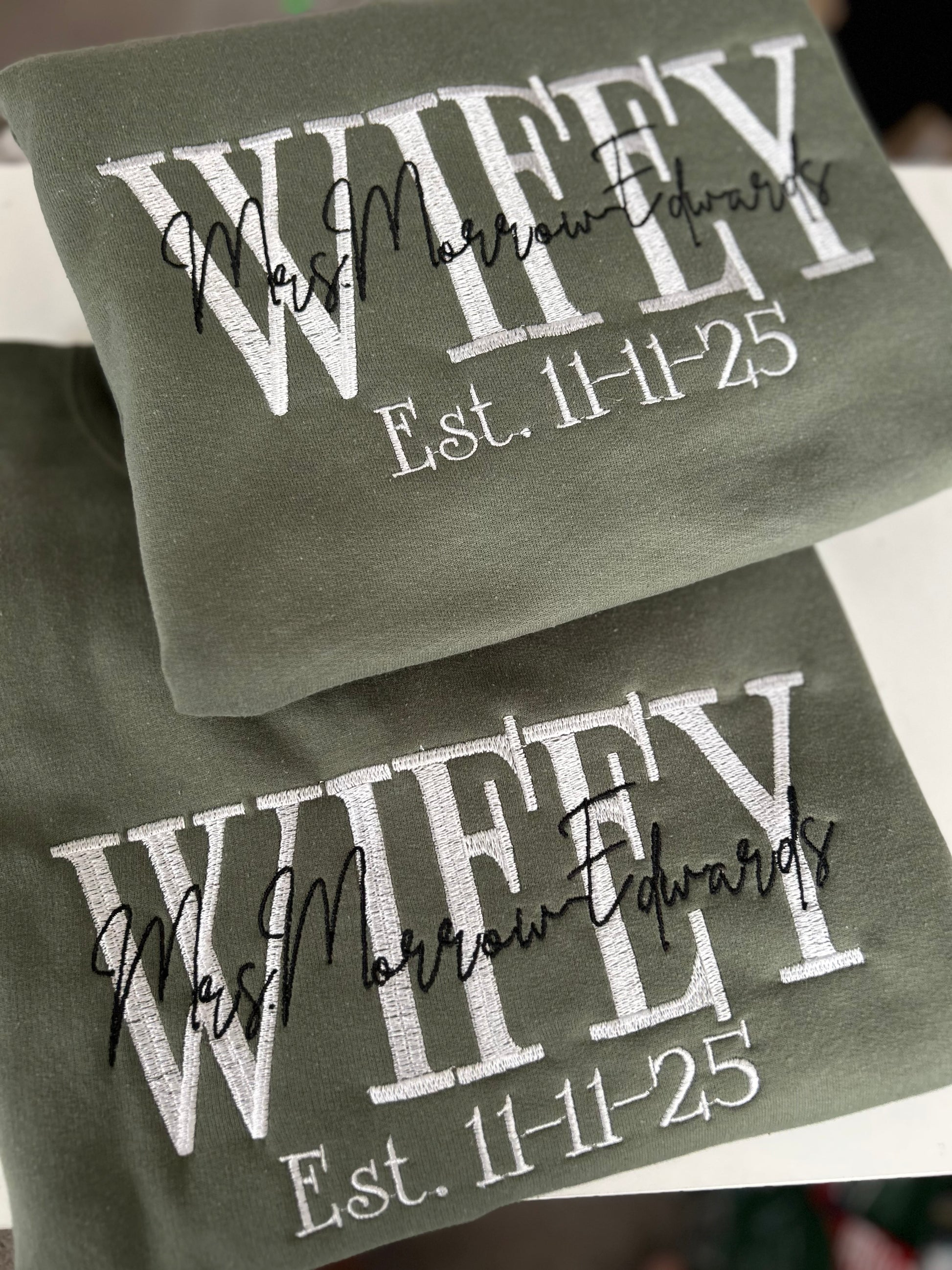 Custom embroidery sweatshirt tailored with couples title, name, and date established.